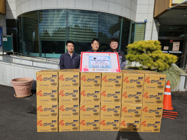 | 지난 12월 3일 스피드메이트 부곡점 김우영 대표와 하늘OA시스템 박지훈 대표는 대곡동행정복지센터(동장 강진규)를 찾아 관내의 저소득가정 및 소외계층에게 전해 달라며 라면 50박스(120만원 상당)를 전달했다.