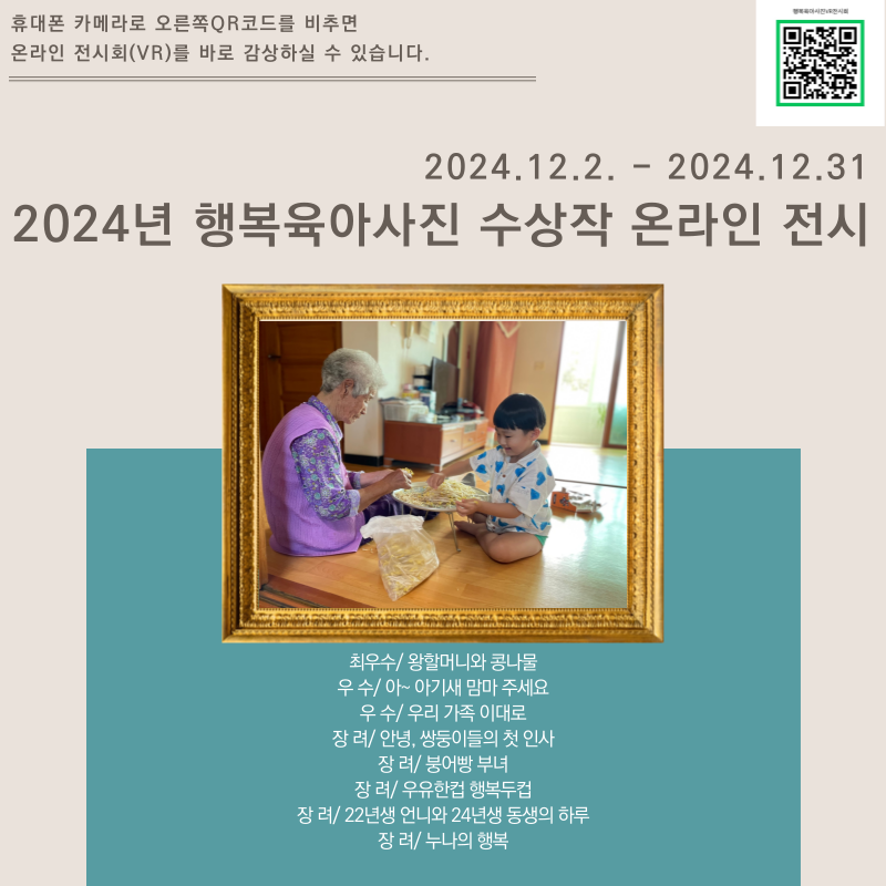 이번 전시회는 행복육아 사진 공모전은 사진을 공모하는데 그치지 않고 공공장소에 전시하여 아이들을 통해 행복을 키우는 부모들에게 힘과 용기를 주는 긍적적인 육아인식 확산과 더불어 저출생 인식개선과 양육친화적 사회분위기를 조성하는 역할을 한다. 특히 이번년도는 VR갤러리 대여를 통해 가상현실 전시로 장소에 구애받지 않고 많은 시민들이 희로애락 육아 이야기를 엿볼 수 있다.