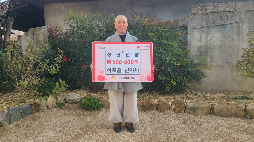 지난 12월 5일 성금을 전달한 인서 스님은“우리 사회의 미래인 청소년들이 잘 자랄 수 있도록 신도와 함께 뜻을 모아 이번 성금을 마련했다”라며,“온정의 손길이 곳곳에 닿을 수 있도록 작은 나눔이라도 함께 하고 싶다”라는 뜻을 아포읍행정복지센터(읍장 김세종)에 요청했다.