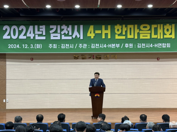 | 김천시 4-H 본부(회장 문장훈)와 4-H 연합회(회장 김정배)는 지난 12월 3일 김천시농업기술센터에서 4-H 회원 및 지도교사, 학교 4-H 회원 100여 명이 한자리에 모인 가운데 「2024년 김천시 4-H 한마음대회」를 개최했다.