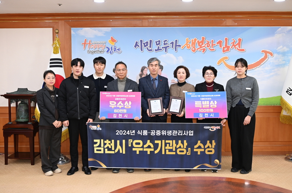 | 김천시는 지난 12월 9일 안동 그랜드호텔에서 열린 경상북도 주관‘2024년 식품·공중위생관리사업 성과대회’에서 식품안전관리사업 특별상 수상, 공중위생관리사업 우수상을 수상해 주목할만한 성과를 거뒀다.