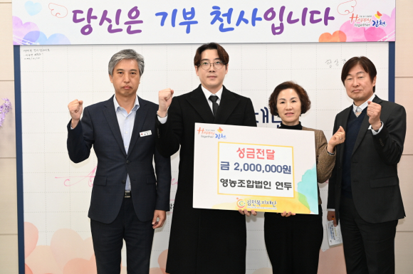 | 김천복지재단은 지난 12월 10일 영농조합법인 연두(대표 이두현)로부터 성금 200만 원을 전달받았다고 밝혔다.