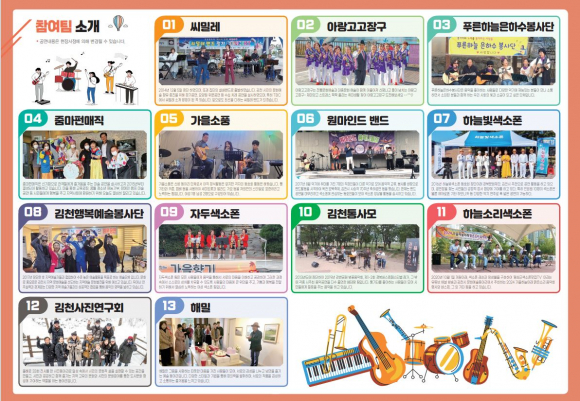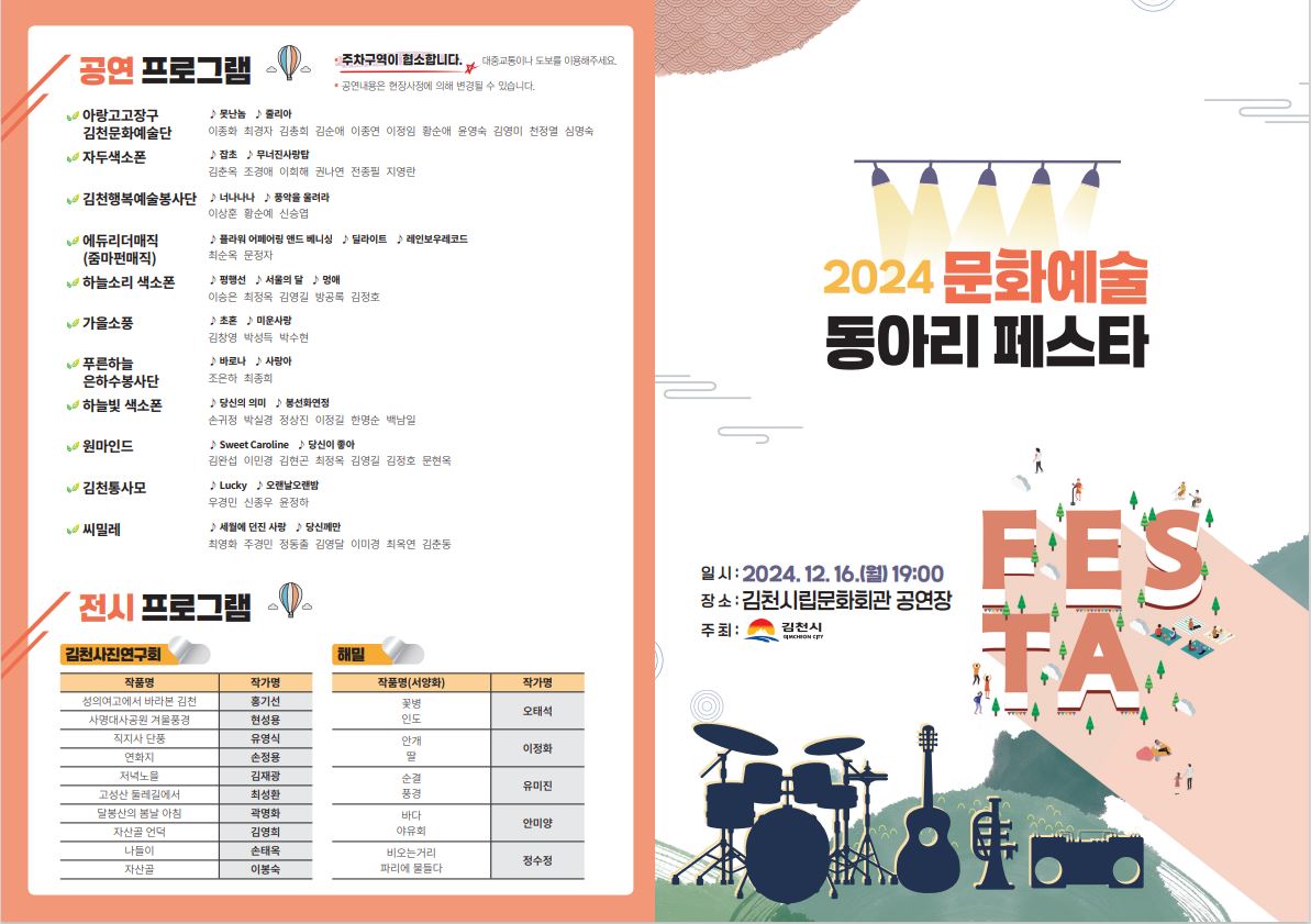 이번 2024 문화예술동아리 페스타는 ‘아랑고고장구 김천문화예술단’ 등 총 13개 팀이 참여하며, 가요, 마술 공연, 장구, 색소폰, 통기타 연주 공연과 서양화 및 사진 작품 전시 등 풍성한 내용으로 시민들에게 선보일 예정이다. 시 관계자는 “이번 행사를 통해 추운 날씨 속 문화 예술과 함께 따뜻한 연말을 맞이하시길 바라며, 시민 여러분께서 많이 참석해 주셔서 함께 즐겨 주시길 바란다.”라고 말했다.