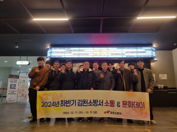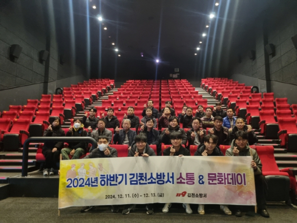 | 김천소방서(서장 안영호)는 12월 11일부터 13일까지 율곡동 CGV에서 영화 소방관을 단체 관람하며 뜻깊은 소통&문화의 날 행사를 진행하였다. 이 행사는 직원 상호 간 소통·화합의 장을 마련하고 직원들의 자긍심 고취 및 활기찬 직장 분위기 조성을 위한 목적으로 기획되었다.