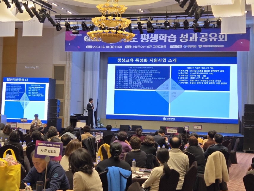 | 김천대학교(윤옥현 총장) 평생교육원은 12월 10일 경상북도와 경상북도 인재평생교육재단에서 시·군, 도민 행복대학 및 평생교육 관련 기관·단체 관계자 등 150여 명이 참석한 가운데 개최된 “2024 경상북도 평생학습 성과 공유회”에서 평생학습 우수사례 발표 기관으로 선정되어 경북 평생교육 특성화 사업 “드론을 활용한 방제·방역 교육” 사례를 발표하였다고 13일 밝혔다.