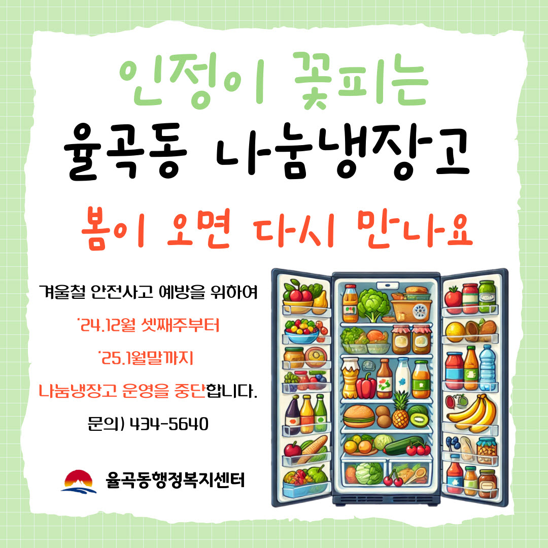 | 율곡동행정복지센터(동장 김병하)는 겨울철 안전사고 예방을 위해 12월 13일을 마지막으로 2024년도 “인정이 꽃피는 나눔냉장고”(이하 “나눔냉장고”) 운영을 종료하고 내년 2월 초 운영을 재개한다고 밝혔다.