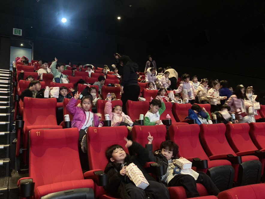 지난 월요일부터 각반에서 영화 관람 예절에 대해 알아보며 영화에 대한 관심과 흥미로 교실은 온통 영화 이야기꽃으로 만발하였다. 당일 영화관에 도착한 유아들은 맛있는 간식을 함께 먹으면서 영화의 서막이 열렸다.