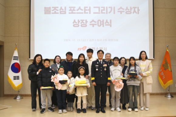 |  | | | ⓒ 김천내일신문 | | 김천소방서는 화재예방 안전공감대 형성을 위해 실시한 ‘2024년 어린이 불조심 포스터 공모전’ 우수작품에 대한 시상식을 12월 13일 개최했다고 밝혔다.