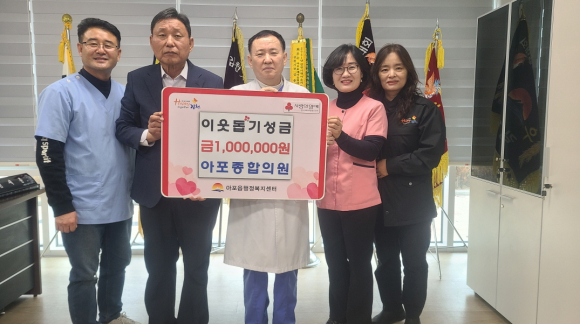 아포종합의원 원장 김덕상은 “관내 어려움을 겪는 이웃들에게 조금이나마 도움이 될 수 있기를 바라는 마음으로 성금을 전달하게 됐다. 앞으로도 어려운 이웃들에게 관심을 가지고 지역사회와 사랑을 나누는 병원이 되도록 지속해서 노력을 펼치겠다.”라고 말했다.