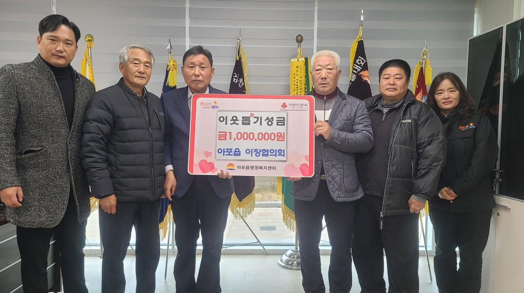 아포읍 이장협의회 회장 박희병은“우리 지역의 이웃들이 희망과 행복이 가득하길 바라는 마음으로 모두가 한마음 한뜻으로 성금을 전달하게 됐다.”라며“앞으로 지역사회 곳곳에 온기를 전할 수 있도록 다양한 나눔 활동을 이어가겠다”라고 말했다.