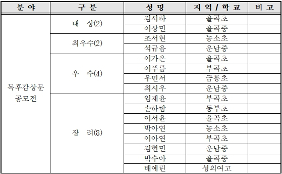 이날 독서문화진행 유공자들을 축하하기 위해 자리한 김동진 경제관광국장은 “시민들이 한 해 동안 도서관에서 진행한 다채로운 프로그램의 결실을 보는 자리에 함께하게 되어 뜻깊고 의미가 있는 시간이었다. 독서란 삶의 쉼이라는 한 학생의 소감이 인상적이었고, 도서관이 시민들의 삶의 쉼터가 될 수 있도록 최선의 노력을 다하겠다.”라고 말했다.