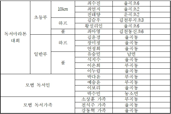 시상식은 초·중·고등학생을 대상으로 한 ‘독후감상문 공모전’ 수상자, 마라톤 종목과 독서활동을 접목한 시민 독서운동 프로그램 ‘독서마라톤 대회’ 우수 완주자, 도서관을 모범적으로 이용하는 개인과 가족에게 수여하는 ‘모범 독서인·독서가족’ 순으로 진행됐다.