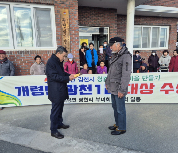 | 김천시 개령면 광천1리(이장 안병배)는 12월 16일, 김천시 「2024년 청결한 우리마을 만들기」 사업에서 대상을 수상했다.