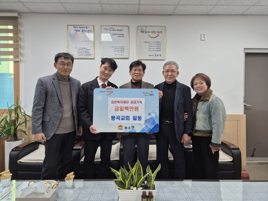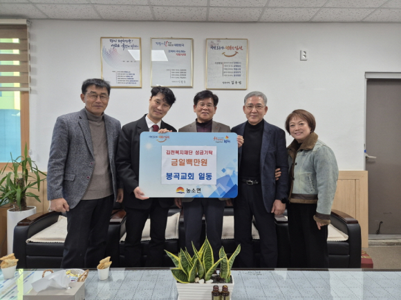 | 김천시 농소면 봉곡교회(담임목사 이형욱)는 지난 12월 17일 연말을 맞아 소외되고 어려운 이웃을 돕기 위해 김천복지재단에 100만 원을 전달했다.