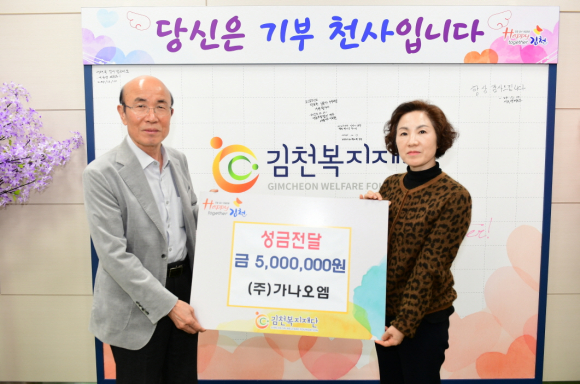 | 김천복지재단은 지난 12월 16일 ㈜가나오엠(대표 홍중표)로부터 성금 500만 원을 전달받았다고 밝혔다.