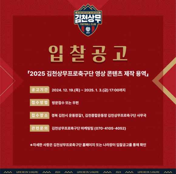 | 김천상무프로축구단(단장 이재하)이 12월 19일부터 ‘2025 김천상무프로축구단 영상 콘텐츠 제작 용역’에 대한 공개 입찰을 진행한다. 주요 사업 목적은 영상 콘텐츠 기획 및 제작, 영상 콘텐츠의 양·질적 향상을 통한 구단 브랜딩 강화, 화제 유발 및 팬 프렌들리 강화 등이 있다.