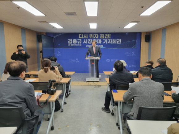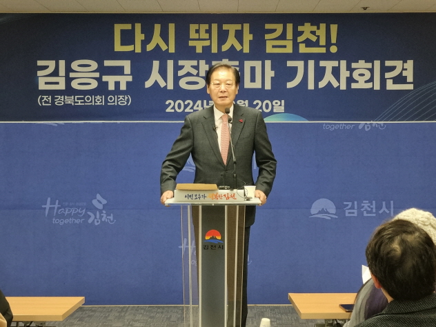 |  | | | ⓒ 김천내일신문 | | 김천시청 브리핑룸에서 12월20일 김응규 예비후보자는 2025년도 4월2일 김천시장 재선거에 출마를 선언하는 기자회견을 가졌다. 안녕하십니까? 연말연시 바쁘심에도 시간을 내어주신 각 언론사 관계자 분들께 먼저 감사의 인사를 드립니다. 전, 경상북도 의회 의장 김응규입니다. 대통령 탄핵 등 나라가 어수선한 혼돈의 시기에 우리 김천시 마져 초유의 시정 공백으로 참으로 어렵고 안타까운 현실입니다. 지난 지방선거에서 자유 한국당 시장공천을 받고도 오롯이 저의 부족함으로 오늘의 김천을 혼란 스럽게 한 사람으로서 매우 송구스럽게 생각합니다. 존경하는 김천시민 여러분! 우리 자랑스러운 고장 김천이 어쩌다 이렇게 되었나 하는 자괴감 마저 듭니다.하지만 초스피드 시대에 1초도 지체할 수 없는 위기의 현실을 극복하여야만 합니다. 위기는 곧 기회라는 말이 있습니다. 시정 공백과 잘못된 관행을 과감한 개혁과 쇄신을 통하여 다시 출발 하는 대 변화가 필요 합니다. 경험이 풍부하고 저돌적인 추진력, 위기에 강한 제가 시대의 부름을 받은 소명의식을 갖고 내년 4월 2일 김천시장 재선거에 출마를 하고자 합니다. 사랑하는 시민여러분! 시민 여러분들께서도 잘 아시다 시피 우리 김천시는 조선시대 전국 5대시장의 하나로 상권이 발달하였으며, 1906년 경부선 철도가 개통되어 교통의 요지로 발전하였으며,1949년에는 포항시와 함께 경상북도에서 처음 시로 승격하는 등 농경시대에는 꽤나 활발한 도시로 성장하였습니다. 하지만 1970년대 산업화시대에는 인근 구미시와는 달리 산업화에 부응하지 못하고 쇠퇴를 거듭해 왔습니다. 민선시장 이후 2006년도 전국체전 개최와 경부고속철 역사설치 참여정부의 국토균형개발의 힘입어 혁신도시가 조성되어 잠시 성장의 기회가 있었습니다만은 수도권 집중화와 저 출생 고령화로 인한 인구감소, 성장전략 부재 등으로 매우 어려운 형편이 되어있습니다. 존경하는 시민 여러분! 지방소멸 도시에 포함되어있는 우리들의 자랑스러운 고향 김천을 이대로 방치하고 있어야 하겠습니까? 다시 뛰자 김천! 힘내자 김천! 이라는 슬로건으로 저에게 위기를 기회로 바꾸는 소임을 맡겨 주신다면 다양하고 풍부한 경험과 늘 여러분과 함께 동고동락한 애향심과 강력한 리더쉽으로 불편하고 불안하고 부당한 모든 것들을 확 바꾸어 보겠습니다. 첫째 자연제해와 유해한 환경으로부터 시민여러분의 생명권, 재산권, 건강권을 반드시 지켜드리겠습니다. 둘째 지역화폐 발행 임대금 보조 등 소상공인 자영업자 보호정책을 연구검토 하겠습니다. 특히 명품 프리미엄아울렛 유치, 대형 농산물 도.소매시장 개설과 관광자원을 개발 연계하여 연 500만명이상 김천을 찾는 관광객을 유치하여 지역경제에 보탬이 되도록 하겠습니다. 셋째 구 도심과 혁신도시의 상생발전 전략을 수립 하겠습니다. 아울러 도·농 복합도시로 각 농가에 필요한 보조금 등 지원 대책을 마련하겠습니다. 넷쩨 대학 부속병원과 노인전문 병원을 유치하여 의료 써비스의 질을 높이겠습니다. 다섯째 대학에서 사회 복지학을 전공한 사회복지 전문가로서 노인, 아동, 장애인 등 복지만큼은 제가 확실하게 빈틈없는 복지서비스망을 설치 하겠습니다. 존경하는 시민 여러분! 우선 시급하고 실현 가능한 공약 몇가지를 간단하게 말씀드린 부분은 잠시뒤 기자분들의 질문 시 소상히 답변드리도록 하겠습니다. 사랑하는 시민 여러분! 김천을 누가 더 알고 김천시민을 누가 더 잘 알고 김천과 시민을 위하여 누가 더 일하였습니까? 어렵고 힘들 때나 즐거울 때 여러분들과 오랫동안 함께 김천을 지켜온 정치인이 누구 입니까? 저 김응규가 위기의 9회 말 투아웃에 비장한 각오로 등판하는 확실한 구원 투수가 되겠습니다. 항상 성원과 격려를 보내주신 존경하는 시민 여러분! 만사유시라는 말이 있습니다. 모든 일은 때가 있다는 말입니다.지금 김천이 저 김응규를 부를 때라고 저는 확신을 합니다. 물이 흐르다 막히면 돌아가고 뚤고 가듯이 세월 또한 그냥 흐르지 않습니다. 인생의 스토리가 많은 저 김응규가 4전5기의 오뚜기 정신으로 김천을 살리고 확 바꾸겠습니다. 존경하는 시민 여러분! 올 한해 정말 수고하셨습니다. 새해 복많이 받으시고 건강하시기를 기원 드립니다. |  | | | ⓒ 김천내일신문 | |