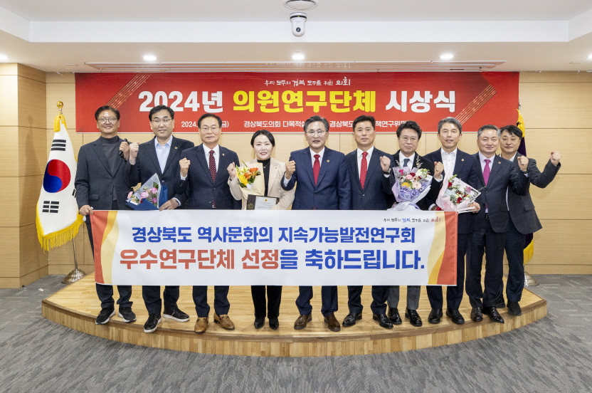 | 경상북도의회는 지난 12월 20일 의원연구단체의 연구 성과를 격려하는 시상식을 도의회 다목적실에서 개최했다. 이번 시상식에서는 「경상북도역사문화의지속가능발전연구회」(대표 정경민 의원)와 「교육거버넌스정책연구회」(대표 정한석 의원)가 2024년 우수의원연구단체로 선정되어 우수연구단체상을 수상하였으며, 「경상북도경계지역발전연구회」(대표 : 김홍구 의원)는 지난 2년간의 활발한 활동에 대해 공로패를 수상하였다.