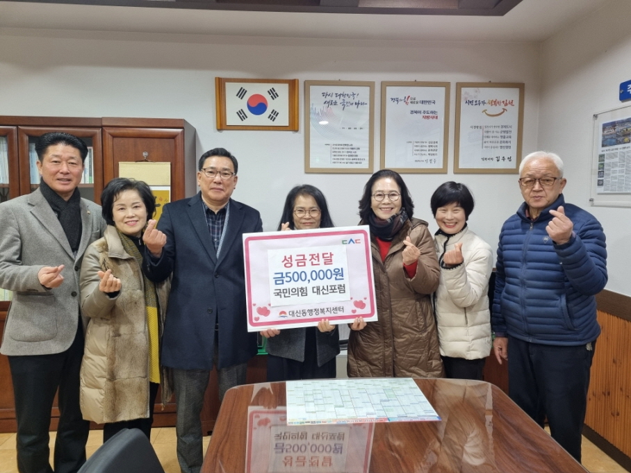 | 국민의힘 대신포럼(회장 이옥혜)은 12월 23일, 어려운 이웃을 위해 사용해달라며 대신동행정복지센터에 이웃돕기 성금 50만원을 전달하였다.