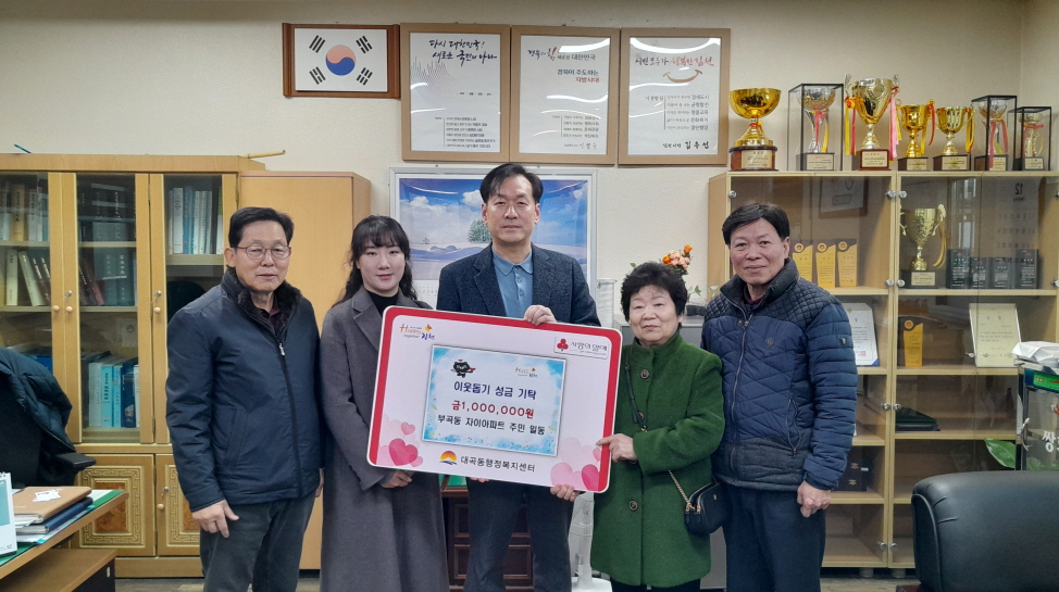 | 김천센트럴자이아파트 주민 일동은 12월 23일 대곡동행정복지센터를 방문하여 어려움을 겪고 있는 저소득계층을 위해 사용해 달라며「희망2025 나눔캠페인」 성금 100만 원을 기탁했다.