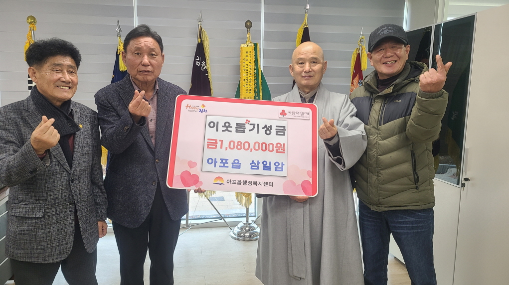 | 김천시 아포읍은 지난 12월 23일, 봉산리 소재 삼일암(주지 도현) 연말을 맞아아포읍행정복지센터를 방문하여 어려운 이웃을 위한 성금 108만원을 전달했다.