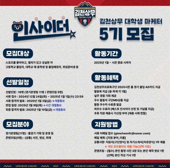 | 김천상무프로축구단이 12월 24일부터 2025시즌을 함께 만들어 갈 대학생 마케터 ‘인사이더 5기’를 모집한다. 모집인원은 총 16명(경기운영팀 11명, 콘텐츠팀 5명)으로 대상은 스포츠를 좋아하고 열의가 있고 성실한 자와 고등학교 졸업자, 대학교 재·휴학생 및 졸업예정자, 취업준비생 등이다.