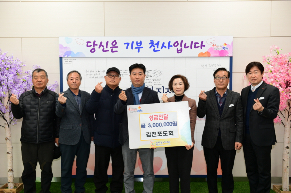 | 김천복지재단은 지난 12월 26일 김천포도회(회장 김희수)로부터 성금 300만 원을 전달받았다고 밝혔다.
