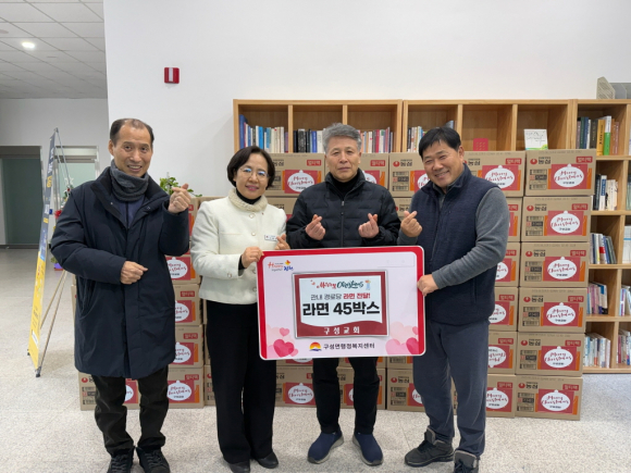 | 김천시 구성면(면장 이혜정)은 12월 26일 구성교회(담임목사 이호건)가 성탄절을 맞아 구성면 관내 경로당 및 마을회관에 라면 45박스를 기증하며 따뜻한 나눔의 손길을 전했다고 밝혔다.