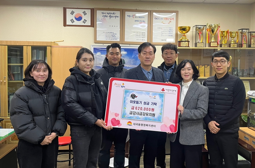 | 금강사 금강유치원은 지난 12월 26일 김수경 원장 및 학부모운영위원들이 대곡동행정복지센터를 방문하여 어려운 이웃을 위한 성금 62만 원을 전달하였다.