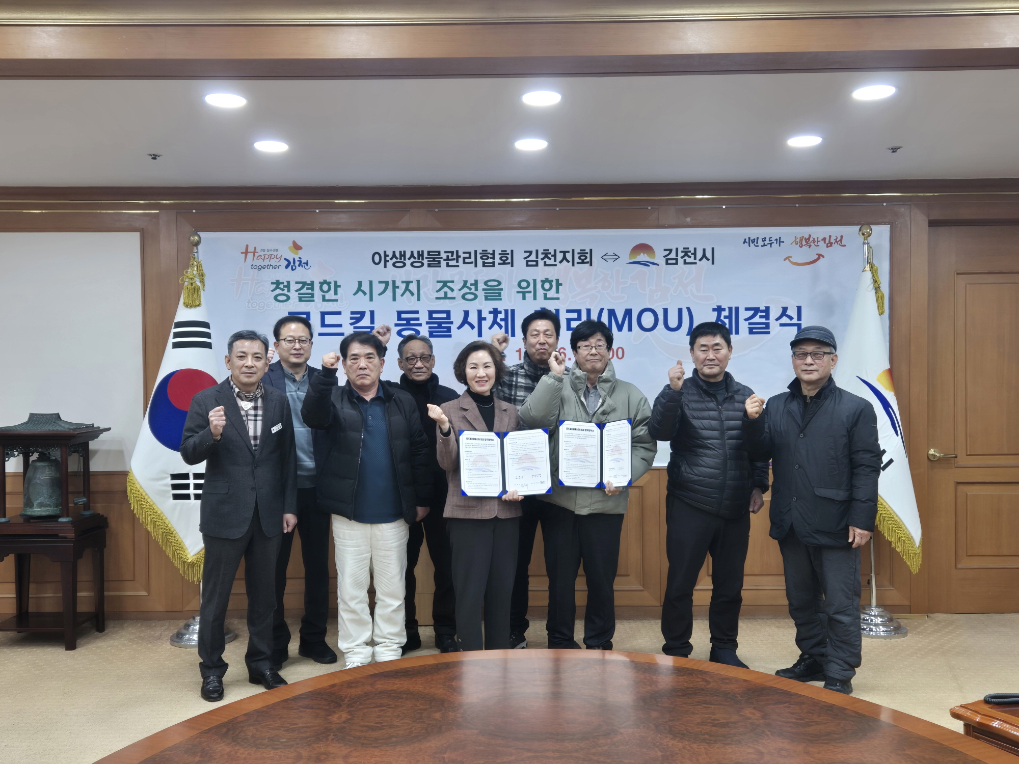 | 김천시는 지난 12월 26일 야생생물협회 김천지회(회장 문영순)와 고라니, 개, 고양이, 족제비 등 로드킬로 인해 도로에 유기된 동물사체 처리에 따른 업무협약을 체결했다.