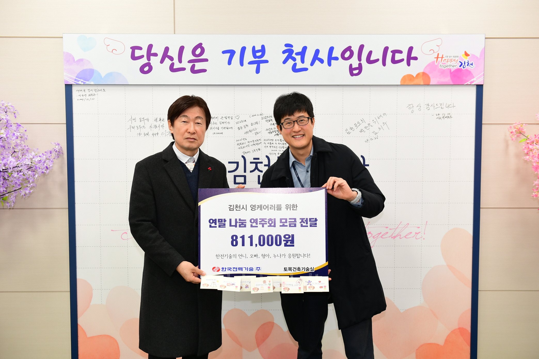 | 김천복지재단은 지난 12월 26일 한국전력기술 토목건축기술실 외 임직원들로부터 성금 81만 1천 원을 전달받았다고 밝혔다.