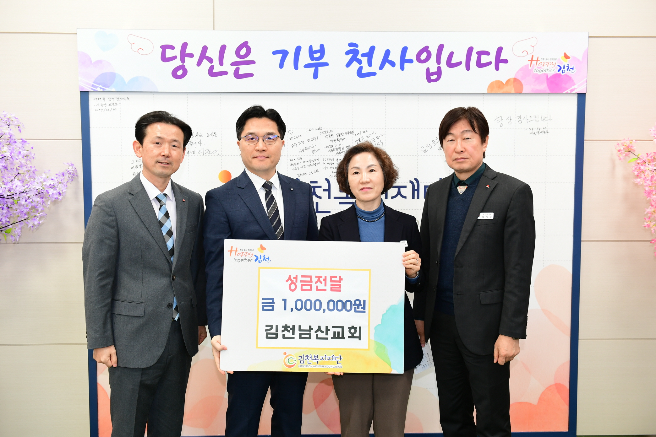 | 김천복지재단은 지난 12월 27일 김천남산교회(담임목사 김명환)로부터 성금 100만 원을 전달받았다고 밝혔다.