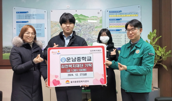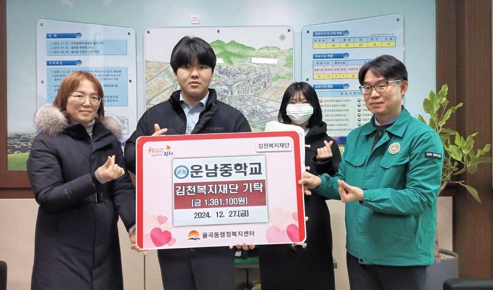 | 운남중학교(교장 전용희)는 12월 27일 오후 율곡동행정복지센터를 방문하여 김천복지재단 후원금 138만 1,100원을 기탁했다.