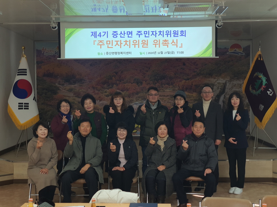 | 증산면에서는 지난 12월 27일 지역주민 16명을 제4기 증산면 주민자치위원으로 위촉했다. 11월 27일부터 15일간 주민자치위원을 공개 모집했으며, 금번에 위촉된 위원은 2025년 1월부터 증산면 주민자치위원으로 활동하게 된다.