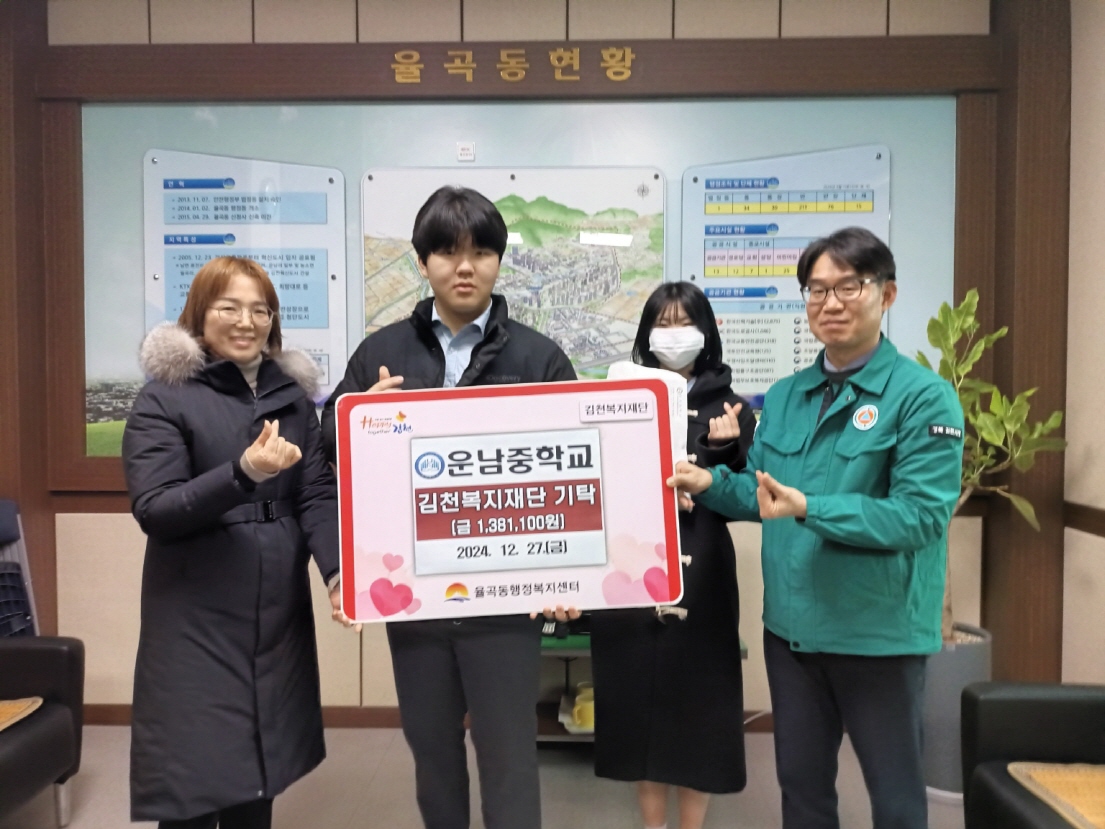 | 운남중학교(교장 전용희)는 12월 27일 율곡주민자치센터에 방문하여 이번 학술제 및 축제 기간(2024. 12. 23.~24.) 동안 꿈사다리반을 비롯한 총 7개 동아리 및 방과후학교의 활동 결과물 판매와 푸드 트럭 및 학생회의 알뜰장터를 통해 마련한 수익금 1,381,100원을 김천복지재단에 기부하였다.