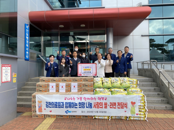 | 김천시 자산동에 위치한 김천의료원에서(원장 정용구) 12월 30일 자산동행정복지센터를 방문해 지역의 어려운 이웃을 돕기 위한 쌀 100포(10kg)와 라면 100상자를 기부했다. 김천의료원은 오랜기간 김천시민의 곁에서 공공의료서비스를 제공하며 시민들의 건강을 책임지는 병원으로서 해마다 연례행사로 취약계층 의료비 및 보훈단체 지원 등 기부활동을 지속해 왔다.