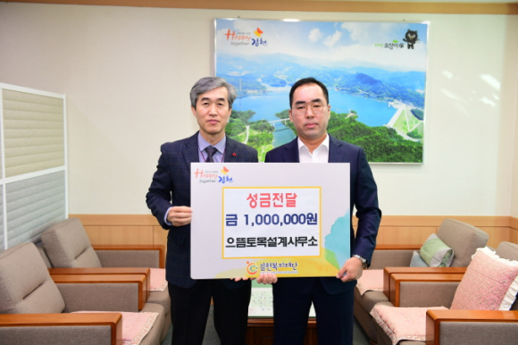 |  | | | ⓒ 김천내일신문 | | 김천복지재단은 지난 1월3일 으뜸토목설계사무소(대표 김동완)로부터 성금 100만 원을 전달받았다고 밝혔다.