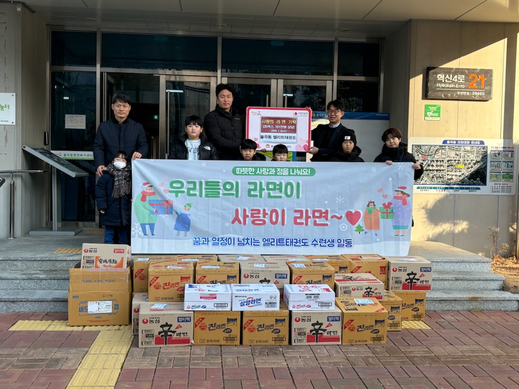 김병하 율곡동장은 “나눔과 기부로 이웃사랑을 실천하신 엘리트 태권도 학생들과 학부모, 정주용 관장님께 감사드리며, 겨울 추위로 더욱 힘든 시간을 보내고 있을 이웃들에게 라면과 함께 아이들의 따뜻한 마음도 잘 전달하겠다.”라고 고마움을 전했다.
