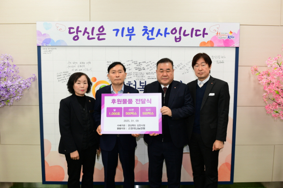 | 김천시는 지난 1월 9일 (사)한국나눔연맹(이사장 안미란)으로부터 백미 10kg 1,000포, 컵라면 500상자, 김치(5kg) 500상자 등 총 5,000만 원 상당의 물품을 기부받았다고 밝혔다.