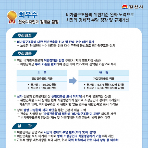 최우수에 선정된 건축디자인과 김태훈 팀장(시설 6급)은 노후화된 건축물의 누수 해결을 위해 설치한 비 가림 구조물이 위반건축물로 신고·단속되는 건수가 매년 증가하는 문제점을 개선하고자 비 가림 구조물 양성화 및 이행강제금 기준 완화를 위해 상위 법령 개정을 지속 건의하였으며, 자체 이행강제금 감경을 추진해 시민의 경제적 부담 경감에 힘썼다는 평가를 받았다.