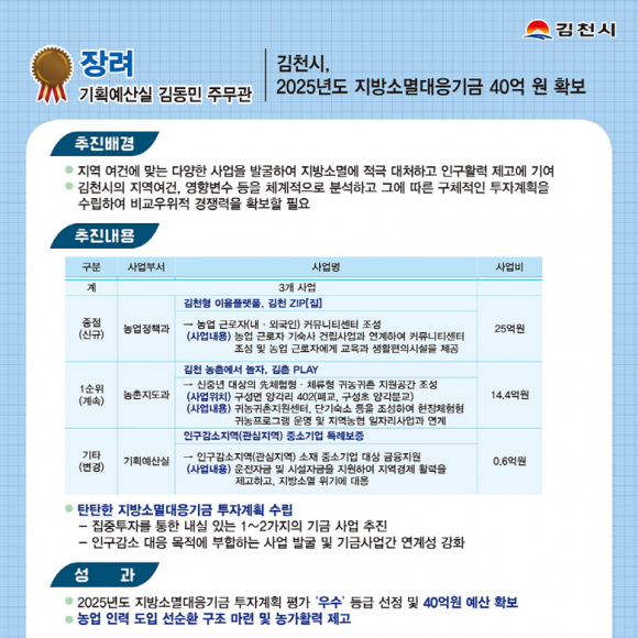 장려에 선정된 기획예산실 김동민 주무관(행정 8급)은 지방 소멸 위기에 적극 대처하기 위하여 지역 여건에 맞는 다양한 인구감소 대응 사업을 발굴하고, 탄탄한 투자계획을 수립하여 2025년 지방소멸대응기금 투자계획 평가에서 ‘우수’ 등급에 선정돼 기금 예산 40억 원을 확보했다.