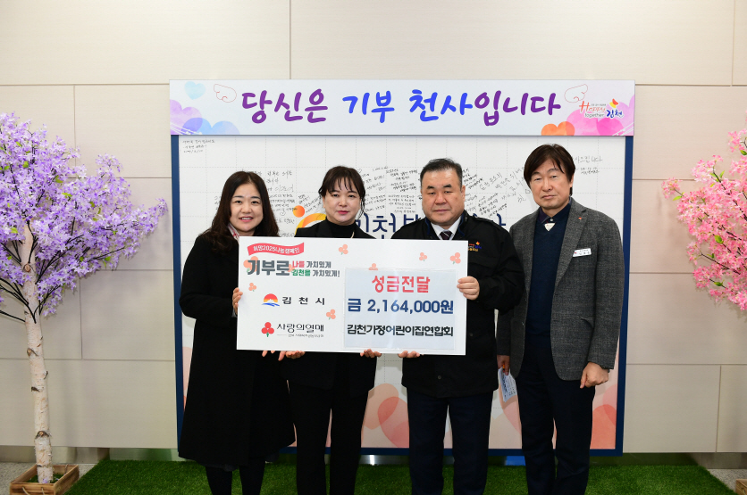 | 김천시는 지난 1월 14일 김천시 가정어린이집연합회(회장 박수빈)로부터 이웃돕기 성금 216만 4천 원을 전달받았다고 밝혔다.