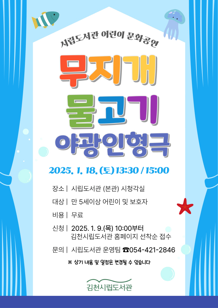 김천시립도서관, 1월 18일 어린이 야광 인형극 <무지개 물고기> 공연