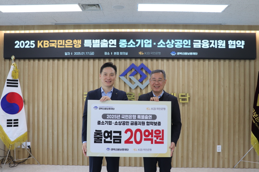 | 경북신용보증재단(이하 ‘재단’)이 1월 17일, 경기침체로 어려움을 겪고 있는 경북도내 중소기업 소상공인의 경영위기 극복을 위해 국민은행과 「2025 국민은행 특별출연을 통한 중소기업·소상공인 금융지원 협약보증」을 체결했다.