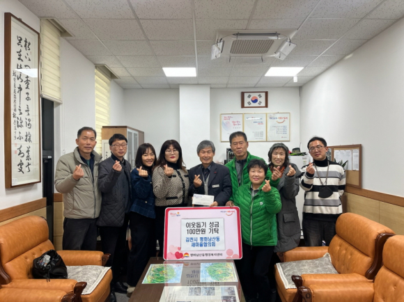| 김천시 평화남산동 새마을협의회(회장 신광식)는 지난 1월 17일 평화남산동 행정복지센터를 방문해 취약계층을 위한 사랑의 이웃돕기 성금 100만 원을 기부했다. 평화남산동 새마을협의회는 김장 나누기, 집 청소 봉사활동, 환경정비 등 다양한 봉사활동을 통해 지역사회에 꾸준히 이바지해왔으며, 지난해에 이어 올해도 성금을 기부하며 이웃 사랑을 지속 실천하고 있다.