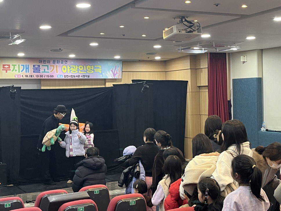| 김천시립도서관(관장 이순영)은 지난 1월 18일 평화남산동 본관에서 200명의 관람객이 자리한 가운데 어린이 인형극 「무지개 물고기」를 성황리에 마쳤다고 밝혔다. 어린이 야광 인형극 「무지개 물고기」는 아이들에게 꾸준히 사랑받는 베스트셀러 그림책을 각색한 공연으로, 매사 이기적이고 자신밖에 모르던 무지개 물고기가 좌충우돌 끝에 친구의 소중함과 이웃과 나누는 즐거움을 깨닫게 되는 내용을 담고 있다.