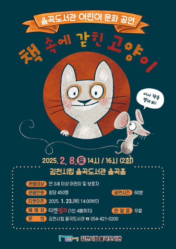 | 김천시립율곡도서관(관장 이순영)은 겨울방학을 맞아 오는 2월 8일, 오후 2시와 4시 두 차례에 걸쳐 율곡도서관 율곡홀에서 어린이와 가족을 위한 뮤지컬 「책 속에 갇힌 고양이」를 개최한다.