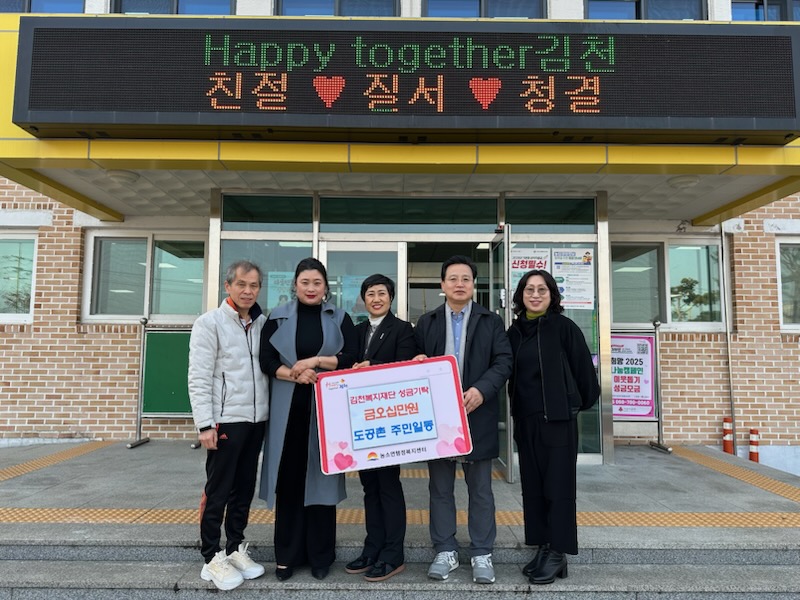 | 김천시 농소면 도공촌리(이장 박찬우) 주민 일동은 지난 1월 21일 을사년 새해를 맞이하여 소외되고 어려운 이웃을 돕는 데 써 달라며 김천복지재단에 불우이웃돕기 성금 50만 원을 기부했다.