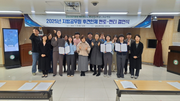 | 경상북도김천교육지원청(교육장 모태화)은 1월 23일 오후2시 김천교육지원청 대회의실에서 신규 공무원과 선배 공무원 12명이 참석한 가운데 지방공무원 후견인제 멘토-멘티 결연식을 개최했다.