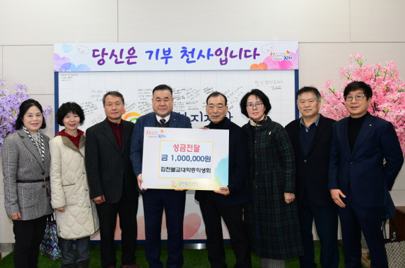 | 김천복지재단은 지난 1월 22일 김천불교대학 총학생회(회장 맹종만)로부터 이웃돕기 성금 100만 원을 기부받았다고 밝혔다. 이번 성금은 연말연시를 맞아 어려운 이웃들과 온정을 나누고자 총학생회 회원들이 십시일반 정성을 모아 마련한 것이다. 김천불교대학 총학생회는 불교의 핵심 가치인 자비를 실천하며, 지속적인 봉사와 나눔 활동을 통해 지역사회와의 유대감을 강화하고 있다.